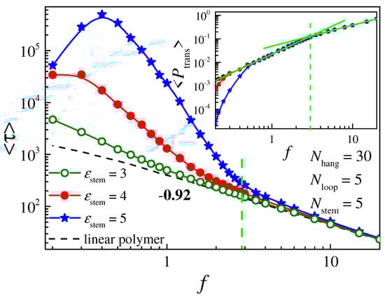 We also see in Figure 4, Figure 5 and Figure 7 that the lines for the translocation times under different driving forces are crossed. For instance, in Figure 7, when Nhang is small, the translocation time τ for f = 0.2 is smaller than that for f = 0.3. Meanwhile, when Nhang is large, τ for f = 0.2 is larger than that for f = 0.3, indicating that the driving force does not simply facilitate the translocation. The influence of the driving force f on the translocation time is studied using the simulation method, and the results are shown in Figure 8. The dependence of the translocation probability on f is also plotted in the inset of Figure 8. We can see that for a linear polymer (dashed line), the translocation time <τ0> decreases as the driving force f increases via the power law <τ0> ~ f − δ. The exponent δ = 0.92, and the value of δ is less than 1 because the polymer chain is not in an equilibrium state during translocation. δ is slightly larger than the value of 0.8 that we obtained in an earlier work. This is because the size of the nanopore applied in this work is smaller, causing a very slow translocation process that is closer to equilibrium. The reduction in the nanopore size also leads to a lower translocation probability, as shown in the inset of Figure 8. Here, <Ptrans> increases with f via the scaling law <Ptrans> ~ f β, and the value of the exponent β shows two regions: β = 0.9 for the fast translocation region with a strong driving force (f > 3) and β = 1.6 for the slow translocation region with a weak driving force (f < 3). The translocation behavior of the hairpin polymer is different in these two regions. When f > 3, the translocation time <τ> and the translocation probability <Ptrans> of the hairpin polymer are close to those of the linear polymer and independent of the interaction εstem. This is because the hairpin structure can be easily broken into a linear chain under a very strong driving force, so that the translocation process is only dependent on the driving force and not the hairpin structure. When f < 3, the translocation for a linear-like polymer and unsteady hairpin polymer is similar to that of the linear chain, while the steady hairpin polymer exhibits unique translocation behavior. As the driving force f decreases, the translocation time <τ> for the steady polymer initially increases rapidly and then decreases. It shows a non-monotonic dependence on f, and the maximum point of the translocation time occurs at around f = 0.4. The decrease in <τ> in the region of f < 0.4 is related to the rapid drop in the translocation probability <Ptrans>.