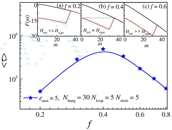 In order to further investigate the non-monotonic influence of the driving force on the displacement time, we enlarged the translocation time curve near f = 0.4 for the hairpin polymer with attractive strength εstem = 5, as shown in Figure 9, and the insets depict the free-energy landscape corresponding to different driving forces. From the free-energy landscape, we can intuitively understand the influence of the driving force on the translocation process. Once the hairpin structure and HB interaction are fixed, the height of the left barrier Hleft mainly depends on the value of f. As shown in inset (b) of Figure 9, the translocation time reaches its maximum when f = 0.4, and the barrier height Hleft = Hright. The probability of the polymer moving forward and backward is the same, resulting in a long waiting time in the potential well. Meanwhile, for the condition of f > 0.4, which is shown in inset (c), Hleft >> Hright, and the monomers can pass through the nanopore easily. As the driving force facilitates the unfolding of the hairpin structure and the translocation process in this region, the translocation time <τ> decreases with increasing f. Meanwhile, when the driving force f is very weak (f < 0.4, shown in inset (a)), the free-energy barrier Hleft << Hright, and the depth of the energy well depends on Hleft, which decreases with decreasing f. Thus, the translocation time decreases in this region, and the decreasing f also causes an increase in Hright. Consequently, fewer polymers with high free energy can pass through the nanopore, leading to a lower probability and short translocation time.