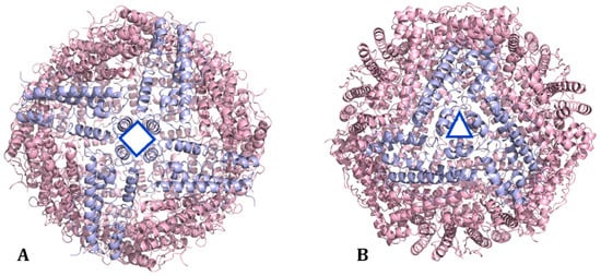 Organization of ferritin subunits to form (A) the four-fold channel C4 and (B) the three-fold channel C3 (PDB code: 5N27) [19].