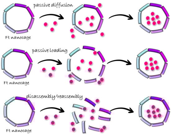 Drug loading comprises two steps: the entering of drugs into a cavity and the remaining of the drugs inside. Current drug-loading approaches use three distinct strategies in the first step: (1) biomineralization or passive diffusion, in which drugs diffuse inside the ferritin cavity through protein channels; (2) passive loading, which enlarges ferritin channels, allowing bigger molecules to enter; (3) disassembly–reassembly of the nanocages, which opens the ferritin cage to allow drug loading in the bulk and to restore the structure after encapsulating drugs [24] (Figure 5).