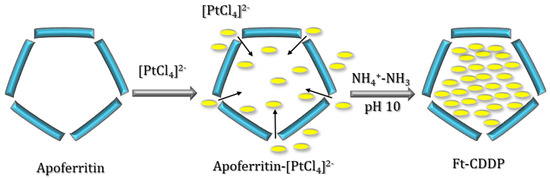Yang and et al. took advantage of molecules diffusion towards ferritin channels to prepare ferritin-CDDP nanocomposites by an in situ procedure, using horse spleen ferritin (apo form, apoFt) [51]. An excess of K2PtCl4 (500: 1, Pt/Ft cage) was slowly added to a ferritin solution at pH 8.5. Then, apoFt-CDDP was obtained after the addition of NH4+–NH3 buffer solution at pH 10 to the AFt-PtCl4 solution (Figure 6).