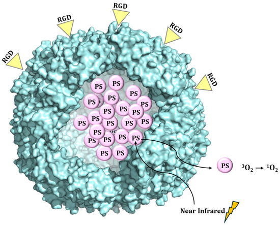 Targeted delivery is an important goal of photodynamic therapy, aimed at increasing tumor selectivity and the tumor/normal tissue accumulation ratio and avoiding off-target damage to the normal organs and surrounding tissues [35]. Zhen et al. loaded a RGD4C-modified ferritin (RFRT) with zinc hexadecafluorophthalocyanine (ZnF16Pc), a potent photosensitizer (PS) with a high 1O2 quantum yield and poor water solubility [35] (Figure 9). Drug loading was achieved by adding ZnF16Pc in DMSO into a RFRT solution in PBS pH 7.4 and, after that, incubating at room temperature for 45 min.
