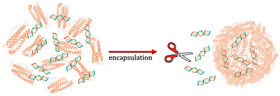 Speaking of encapsulating huge molecules within ferritin nanocages, Li et al. developed ferritin nanocarriers for the delivery of small interfering RNA (siRNA) [63]. RNA loading was performed by disassembling hHFt at pH 2 according to the standard procedure discussed above (Figure 11). The treatment of siRNA-Fts with RNases removed siRNA molecules on the ferritin outer surface.