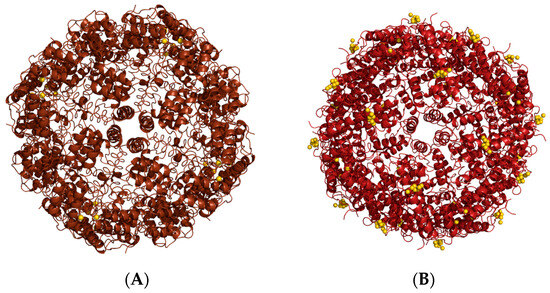 Cartoon representation of the cage structures of (A) Auranofin-loaded horse spleen ferritin and (B) Auranofin-loaded human H-chain ferritin. Gold atoms are depicted as yellow spheres.