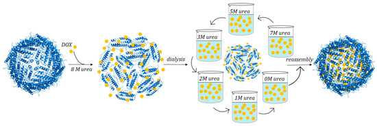 hHFt-DOX nanoparticles were prepared by loading DOX into the cavities of hHFt nanocages through disassembling in 8 M urea, in the presence of DOX, followed by a reassembling process with a series of stepwise gradients of urea from 8 M to 0 M in PBS buffer [78] (Figure 13).