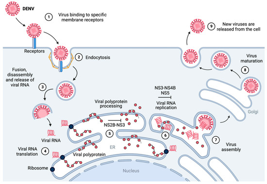 Schematic representation of the replication cycle of dengue virus [31,40]. (1) The virus binds to host-cell membrane receptors and (2) enters the host cell via clathrin-mediated endocytosis. (3) After internalization, the viral particle disassembles and fuses with the endosome, releasing the viral RNA into the cytoplasm. (4) The viral RNA is translated at the rough endoplasmic reticulum into a viral polyprotein. (5) The viral polyprotein is processed by host and viral proteases (such as NS2B-NS3), releasing seven non-structural (NS1, NS2A, NS2B, NS3, NS4A, NS4B, and NS5) and three structural proteins (C, prM, and E). (6) The NS proteins (such as NS3-NS4B and NS5) and the ER (endoplasmic reticulum) form a convolution called the replication complex, which replicates the viral RNA [31]. (7) The replicated genome and translated viral structural proteins are assembled, and immature virus particles stem from the surface of the ER. (8) Viral particles undergo trafficking via the trans-Golgi network, maturing into their infectious conformation. (9) The fully developed virions are liberated from the host cell, thereby facilitating the propagation of infection to neighboring cells. Figure generated with BioRender.com.
