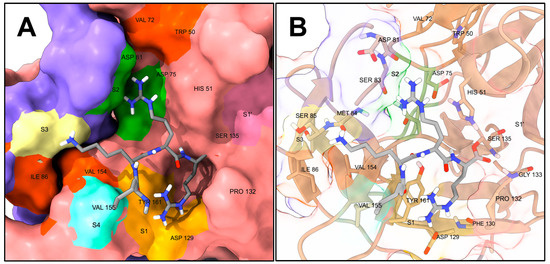 Snapshot of DENV2 NS2B-NS3 bound to the peptide aldehyde Bz-nKRR-H (PDB: 3D1I) [31]. Benzoyl-Nle-Lys-Arg-Arg-H (Bz-nKRR-H) is in dark gray. Only non-polar hydrogens are shown; the Bz- fragment was hidden for displaying purposes. (A) Representation showing the solvent-excluded surface of the protease functionally colored: the light pink surface is from NS3 and the violet from NS2B; S1 is highlighted in light orange, S2 in green, S3 in light yellow, S4 in aquamarine, and S1’ in dark pink; hydrophobic surfaces (generally not addressed as specificity subsites per se) are highlighted in dark orange. (B) Representation showing only the side chains and backbones of relevant amino acids of NS2B-NS3 as sticks; the protease is colored in tan and the rest of its backbone is represented as ribbon. Figure generated with UCSF ChimeraX v1.4 [54,55].