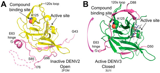 Crystal structures of NS2B-NS3 in (A) open inactive and (B) closed active conformation. Upon substrate binding, the NS2B region (colored purple) spanning residues 63 to 88 undergoes conformational changes around the hinge at residue 63, subsequently interacting with the region adjacent to Ala125, which is located between the 120 s and 150 s loops. Ala125 is depicted as spheres, while the catalytic triad is illustrated as sticks. NS3 is in yellow in (A) and green in (B). The crystal structure of DENV3 NS2B-NS3 protease (B) is complexed with the substrate-like, active-site inhibitor Bz-nKRR-H (represented as white sticks). Figure taken from Yildiz M. et al. ACS Chem Biol. 2013, 8(12), 2744–2752 [75].