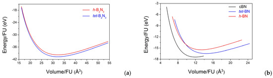 To determine energy trends when considering the different crystal structures of a solid, it is necessary to establish the corresponding equations of state (EOS). It is important to note that one cannot rely on the quantities obtained from lattice optimizations alone, especially when comparing the energies and volumes of the different phases. The underlying physics means that the calculated total energy corresponds to the cohesion within the crystal, and the solutions to the Kohn–Sham DFT equation give the energy in terms of infinitely separated electrons and nuclei. The zero of the energy depends on the choice of the atomic potentials (projector augmented waves (PAWs) as, here, ultra-soft pseudo-potentials (US-PP), etc.); then, it becomes arbitrary by its shift, not by scaling. However, the energy derivatives and the EOS remain unchanged. Therefore, it is necessary to obtain the EOS and extract the fit parameters to evaluate the equilibrium values. This was conducted via a series of calculations of the total energy as a function of volume for the tetragonal and hexagonal phases of new B–N compounds. The resulting E(V) curves, shown in Figure 5, were fitted to the third-order Birch equations of state [42]: