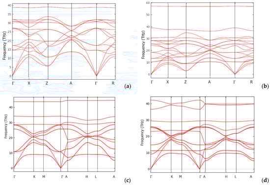 To verify the dynamic stability of the new B–N phases, an analysis of their phonon properties was performed. The phonon band structures obtained from the high resolution of the tetragonal and hexagonal Brillouin zones in accordance with the method proposed by Togo et al. [28] are presented in Figure 6. The bands (red lines) develop along the main directions of the tetragonal (or hexagonal) Brillouin zone (horizontal x-axis) and are separated by vertical lines for enhanced visualization, while the vertical direction (y-axis) represents the frequencies ω, given in terahertz (THz).