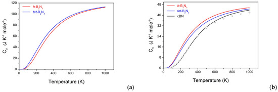 The thermodynamic properties of the new B–N phases were calculated from the phonon frequencies using the statistical thermodynamic approach [44] on a high-precision sampling mesh in the Brillouin zone. The temperature dependencies of the heat capacity at constant volume (CV) for all new boron nitrides are presented in Figure 7 and for B3N3 in comparison with the available experimental Cp data for cubic BN [45]. The heat capacity of tetragonal B2N3 is slightly higher than that of the hexagonal phase (Figure 7a), while the opposite is observed for B3N3 (Figure 7b). The heat capacities of both B3N3 polymorphs are slightly higher than that of cubic BN, which is consistent with their more open structures compared to the dense cubic structure. The observed excellent agreement between the calculated and experimental data for cBN supports the validity of the method used to estimate the thermodynamic properties of new boron nitrides.