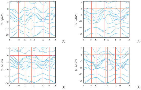 The electronic band structures of the new boron nitrides were calculated using the all-electron DFT-based augmented spherical wave (ASW) method [29] using the crystal structure data from Table 1. The results are shown in Figure 8. The bands (blue lines) develop along the main directions of the respective tetragonal and hexagonal Brillouin zones. The zero energy along the vertical axis is considered with respect to the Fermi level EF. For both B2N3 polymorphs (Figure 8a,b), the bands cross the Fermi level with a tendency toward a weakly metallic behavior. Obviously, a semiconducting behavior is observed for tet-B3N3, where a small gap develops (Figure 8c); hence, the energy reference is now at EV, i.e., at the top of the valence band. Finally, h-B3N3 is clearly metallic with several bands crossing EF (Figure 8d). The different behaviors observed between the two equiatomic phases can be attributed to the fact that tet-B3N3 has considerably lower energy than h-B3N3, as shown in Table 2. As a result, its electronic structure is closer to that of cubic BN. Thus, the new B–N phases exhibit different electronic properties.