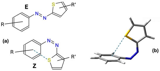 (a) Structures of the E and Z isomers of azothiophenes, created using the JSME structure editor []. (b) Intramolecular interaction (represented using dashed lines) between the lone pair of the S atom on the heteroaromatic ring and the electron cloud of the phenyl ring, stabilizing the Z isomer.