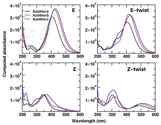 The first remark is that, not surprisingly, the position of the maximum in the absorption band () correlates with the HOMO-LUMO gap (values reported in Figure 2): the higher the value of , the lower the gap. The lower value of is observed for Azothio-a (407 nm), then we have Azothio-b (422 nm), and finally, Azothio-c (430 nm). This band is related to HOMO-LUMO transitions, thus involving the system. Thanks to the results reported as Supplementary Materials to ref. [], we were able to make a qualitative comparison with experiments for the spectra for the E and the Z isomers, though we have to remember that the thiophene ring did not bear any substituent in that study. In the experimental results, moving from the system with no substituent on the phenyl group to the other two, a bathochromic shift is observed (about 30 nm, in agreement with what we found).