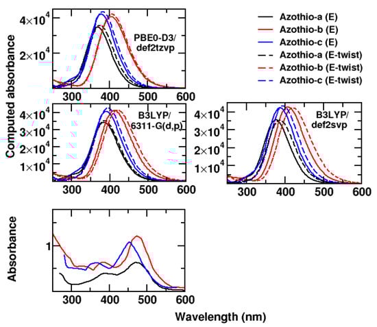 The different theoretical methods provide very similar results for the spectra of the E and of the E-twist minima. They predict a bathochromic shift for the two molecules bearing substituents, whereas the experimental measurements present very similar peaks, with the one of Azothio-c slightly blue-shifted. The PBE0/def2tzvp bands are blue-shifted with respect to the B3LYP results, whereas the B3LYP results obtained with the two different basis sets are very similar. As in the experiment, calculations predict small substituent effects on the band position.