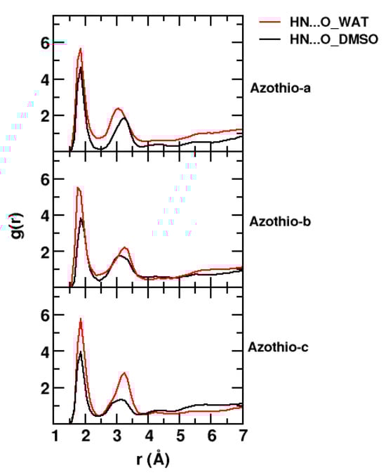 A strong peak, located in all cases at about 1.8 Å, is associated with a strong intermolecular hydrogen bond for first neighbors. It is slightly broader and higher in the radial distributions involving water. A second, well-structured peak is also observed, the position of which is subject to some changes, depending on the system and the type of interaction. In the case of water, this second peak is slightly larger, higher, and situated at slightly larger distances (except for Azothio-a) compared with the second peak of the radial distribution involving DMSO. However, such differences may be attributed to the different sizes and shapes of water molecules compared with DMSO. Overall, we have compelling evidence of a robust and well-structured hydrogen bond network involving the solute and both components of the mixture.
