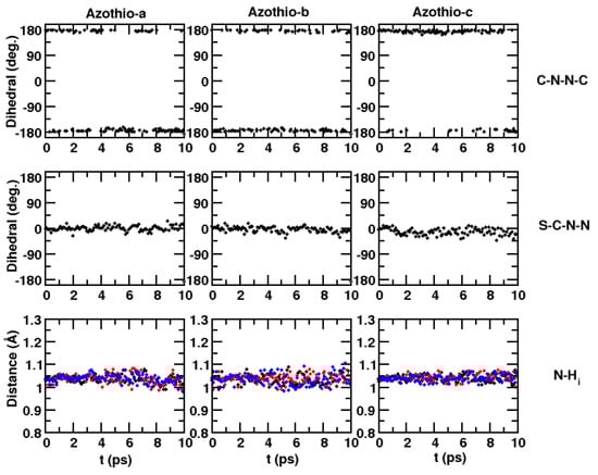 The following step in our work consisted in investigating the evolution of the system along 10 ps QM/MM dynamics. First of all, we focus on the solutes’ structural properties. The C-N-N-C dihedral is not subject to changes along the dynamics compared with the optimized structure obtained with B3LYP/6-311G(d,p) calculations with an implicit solvent. However, the N-N-C-S dihedral is slightly distorted, on average, compared with the static configuration, and fairly large fluctuations around the average value are observed. In the static case, we measured a value of 0.0° for all solutes, whereas in the QM/MM simulations, we found the following average values for Azothio-a to -c (standard deviations are reported in parentheses): (±10°), 0.6° (±15°), (±15°).