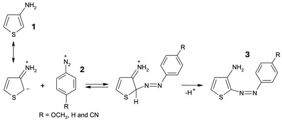 - Gabsi, W.; Boubaker, T.; Goumont, R. Azo-Coupling Reactions of Para-X-Benzenediazonium Cations with 3-Ethoxythiophene in Acetonitrile. Int. J. Chem. Kin. 2016, 48, 266–273. [Google Scholar] [CrossRef]