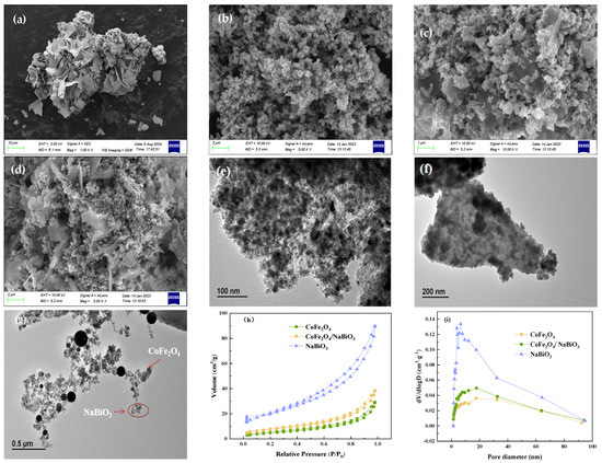 SEM and TEM images, adsorption–desorption curves, and pore size distributions of CoFe2O4, NaBiO3, and CoFe2O4/NaBiO3. (a) NaBiO3 at 10 μm; (b) CoFe2O4 at 2 μm; (c,d) CoFe2O4/NaBiO3 at 1 μm and 2 μm, respectively. TEM images of samples: (e) CoFe2O4; (f) NaBiO3; (g) CoFe2O4/NaBiO3. (h) Adsorption–desorption curve of samples. (i) Pore size distribution of samples.