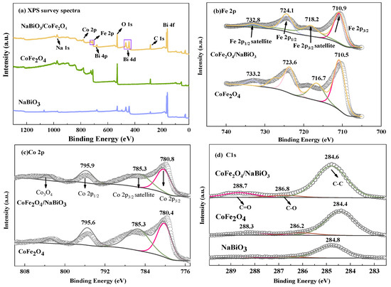 Figure 2 shows the X-ray photoelectron spectroscopy (XPS) spectra for CoFe2O4, NaBiO3, and CoFe2O4/NaBiO3 composite. Analysis of Figure 2a reveals the detection of elements such as Co, Fe, C, O, and Bi within the CoFe2O4/NaBiO3 composite. Figure 2b–e display high-resolution XPS spectra for the elements Co, Fe, C, and Bi, respectively. The high-resolution XPS spectra of the CoFe2O4 (Figure 2b) identifies four prominent peaks corresponding to Fe 2p, with the peaks at 710.5 eV (and a satellite peak at 716.7 eV) and 723.6 eV (with a satellite peak at 733.2 eV) attributed to Fe 2p3/2 and Fe 2p1/2, respectively. The peak at 710.5 eV indicates the presence of Fe2+, and the binding energy of 723.6 eV aligns with the characteristic value of Fe3+ [42]. Upon forming the CoFe2O4 and NaBiO3 composite, these characteristic peaks shift to 710.9, 718.2, 724.1, and 732.8 eV, respectively, indicating a transformation in the chemical environment of CoFe2O4/NaBiO3 and confirming a strong interaction between CoFe2O4 and NaBiO3. Figure 2c illustrates three distinct peaks of Co 2p, centered at 780.4 eV (with a satellite peak at 785.3 eV) and 795.6 eV, corresponding to the orbital peaks of Co 2p3/2 and Co 2p1/2, respectively, primarily associated with Co2+ [43]. The slight shift in these orbital peaks towards higher binding energies in the composite suggests a decrease in electron density, indicative of a robust integration of the elements. The detection of Co 2p and Fe 2p peaks confirms the presence of spinel CoFe2O4 within the composite [44]. The C1s XPS spectra for both CoFe2O4 and CoFe2O4/NaBiO3 are differentiated into three peaks of 284.6 eV, 286.8 eV, and 288.7 eV (Figure 2d), corresponding to C-C, C=O and C-O, respectively [45]. In Figure 2e, the Bi element is precisely identified, with Bi 4f exhibiting two peaks at binding energies of 158.6 and 163.8 eV, characteristic of Bi 4f7/2 and Bi 4f5/2, respectively, and indicative of Bi5+ [46]. For the composite, these peaks shift to 159.3 and 164.6 eV, respectively, aligning with the properties of Bi3+ [47], thereby evidencing a valence state change of the Bi element on the material’s surface and confirming the presence of Bi2O3 as detected in XRD analyses. This shift and the elemental migration observed in the composite compared to the pure substances suggest that CoFe2O4 and NaBiO3 form a heterojunction upon combination, facilitating the transfer of photogenerated electrons.