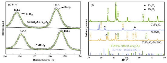 XPS spectra and XRD patterns of CoFe2O4, NaBiO3, and CoFe2O4/NaBiO3. (a) XPS survey spectra; (b) Fe 2p orbital diagram; (c) Co 2p orbital diagram; (d) C 1s orbital diagram; (e) Bi 4f orbital diagram; (f) XRD pattern.