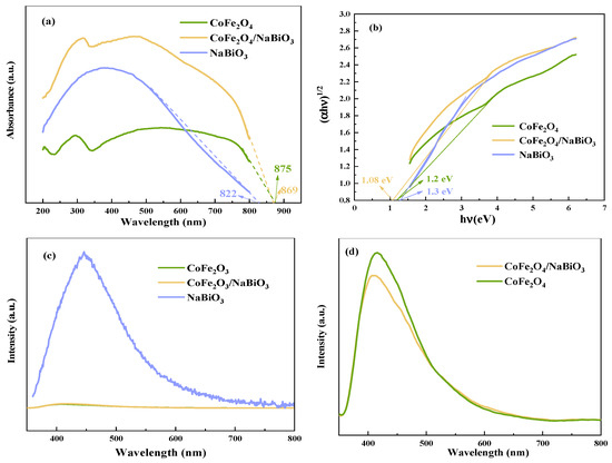 UV-Vis DRS and PL spectra of CoFe2O4, NaBiO3, and CoFe2O4/NaBiO3. (a) UV-Vis DRS spectra; (b) the forbidden bandwidth diagram; (c) PL spectra; (d) local amplification of PL spectra.