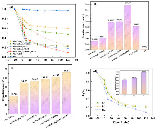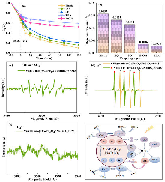 Achieving efficient degradation with a singular photocatalytic technology proves challenging. However, merging two distinct AOPs circumvents their individual limitations while leveraging their synergistic effect to further augment pollutant removal efficiency. SO4−·-based persulfate AOPs (SR-AOPs) have recently emerged as a focal point in organic wastewater treatment in recent years, offering advantages over ·OH and SO4−·, including a higher redox potential (2.5–3.1 V) [38], longer half-life (30–40 μs) [39], broader pH stability, and enhanced robustness. CoFe2O4 has been widely used to activate persulfate (PS) for catalytic oxidation degradation of various pollutants [40,41]. Moreover, visible light activation of PS presents a quicker, more reliable method. For instance, Li [40] used nano-CoFe2O4-activated PMS to degrade atrazine (ATZ), achieving over 99% removal within 30 min. Song [41] explored the Triphenyl phosphate (TPhP) degradation via CoFe2O4-activated PMS, demonstrating a 99.5% removal efficiency under ambient conditions, underscoring the efficacy of the CoFe2O4 -activated PMS process for TPhP degradation. Thus, the photocatalytic technology coupled with persulfate technology using CoFe2O4/NaBiO3 as the catalyst can significantly enhance removal efficiency and reaction speed.