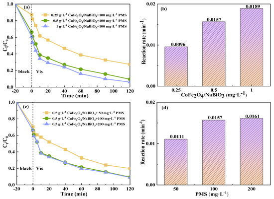The effects of CoFe2O4/NaBiO3 and PMS concentrations on the degradation of TCH in the Vis+CoFe2O4/NaBiO3+PMS system. (a,b) The effects of CoFe2O4/NaBiO3 concentration on TCH removal efficiency and rate. Conditions: [pH] unregulated, [TCH] = 10 mg/L−1, [PMS] = 100 mg/L−1, [catalyst] = 0.25, 0.5 and 1.0 g/L−1. (c,d) The effects of PMS concentration on TCH removal efficiency and rate. Conditions: [pH] unregulated, [TCH] = 10 mg/L−1, [catalyst] = 0.5 g/L−1, [PMS] = 50, 100, 200 mg/L−1.
