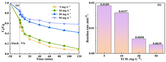 Effect of initial TCH concentration on the degradation of TCH in the Vis+CoFe2O4/NaBiO3+PMS system. (a) Degradation efficiency; (b) reaction rate. Conditions: [pH] unregulated, [TCH] = 5, 10, 20, 50 mg/L−1, [PMS] = 100 mg/L−1, [catalyst] = 0.5 g/L−1.