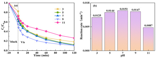 Effect of initial pH value on the degradation of TCH in the Vis+CoFe2O4/NaBiO3+PMS system. (a) The TCH degradation efficiency diagram. (b) The reaction rate diagram. Conditions: [pH] = 3, 5, 7, 9, 11; [TCH] = 10 mg/L−1, [PMS] = 100 mg/L−1, [catalyst] = 0.5 g/L−1.