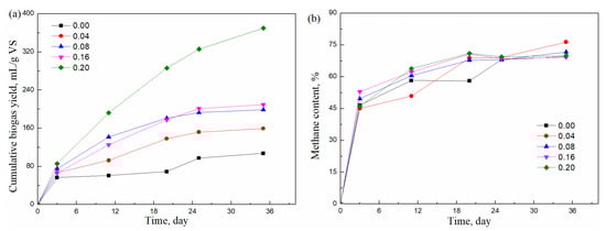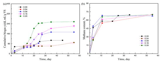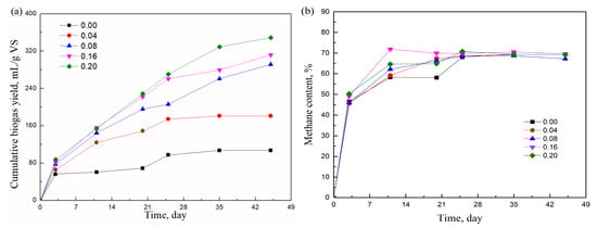 In Figure 2b, it can be seen that the methane concentration followed a similar trend as that shown in Figure 1b. The methane concentration increased sharply to around 50% within the first 3 days and then increased slowly to about 65%. Afterward, the methane concentration remained constant in the range of 65% to 75% until the end of digestion. Compared with adding T20, when adding T60, the methane concentration was slightly higher.