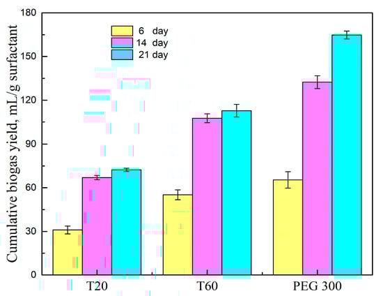 Since surfactants can be digested by anaerobic microbes, the biodegradability of T20, T60, and PEG 300 was evaluated by biogas yield [22]. As shown in Figure 4, the cumulative biogas yields of T20 and T60 changed little after 14 days, while the biogas yield of the samples after adding PEG 300 kept increasing along with the test. The maximum biogas yield was achieved by PEG 300, at 164.8 mL/g surfactant, which was 2.3 times the biogas yield of T20 and 46% higher than that of T60. It was notable that PEG 300 was easily biodegradable because anaerobic microbes can use PEG as a sole carbon source [28]. The biodegradability of T20 and T60 was much lower than PEG 300 because non-ionic surfactants are limited in biodegradation processes; only water-soluble molecules can be metabolized by microorganisms [34]. During the enhanced anaerobic digestion after adding surfactants, the addition ratio of surfactants to grass did not exceed 0.2, indicating that the increased biogas production from surfactants was lower than 32.9 mL/g when adding PEG 300, 22.5 mL/g when adding T60, 14.5 mL/g when adding T20. But the biogas yield of samples with surfactant addition increased much more than the biogas yield from surfactant degradation, suggesting that the enhancement in biogas production was due to the promotion of surfactants on HSAD, and the contribution of surfactant degradation could be ignored.