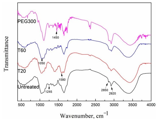The absorption peaks at 2850 cm−1 and 2920 cm−1 predominantly arose from symmetric and asymmetric stretching of –CH bonds [37,38]. The absorption became stronger when PEG 300 was added compared with the untreated grass and those added with Tween, which provided further proof of the interaction between lignocelluloses and PEG 300. The peaks at 1450 cm−1 and 1580 cm−1 were attributed to phenyl ring skeletal vibrations of lignin macro molecules [39]. The small peak that appeared at 1245 cm−1 was due to the in-plane bending vibration of –OH, probably in cellulose. The absorption band at 1050 cm−1 was the stretching vibration of C-O and C-O-C, indicating the existence of pyran ring skeleton vibration. The peaks in the range of 1050~1580 cm−1 exhibited great differences when the substrate was added with PEG 300 in contrast to the untreated grass and those added with Tween. The differences confirmed the interaction between the hydrophobic parts of lignin and PEG [36].