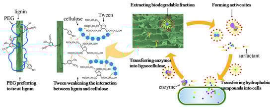 First, the interactions between the surfactants and lignin are somewhat different for PEG 300 and Tween. Some PEG 300 is tied to lignin owing to the interactions between the -CH2 groups in PEG and the hydrophobic parts of lignin such as phenyl and the –CH2 and –CH3 groups [36], which was proven by the FTIR spectrum. Contrary to PEG, Tween could promote the hydrolysis stage by modifying lignin surface properties, such as changing its hydrophobicity, hydrogen bonding ability, and surface charges [19]; thus, the biodegradable fractions are easier to remove from the cages of lignocellulose, which was verified by the high ammonia nitrogen concentration in the digestate. Although PEG and Tween both contain the –(CH2CH2O)– group, the reason for the combination of lignin with PEG instead of with Tween probably is the steric hindrance that prohibits Tween from adsorbing onto lignin. As Figure 6 shows, Tween intervenes in the middle of lignin and cellulose and weakens the interaction, especially the hydrogen bond between them, while PEG goes deep into the lignin structure and ties close to it. This consolidated structure likely hinders microbial access, resulting in the prolonged lag phase observed during digestion with PEG 300 addition. In contrast, the addition of Tween releases more biodegradable fractions, accelerating biogas production in the initial stage of HSAD.