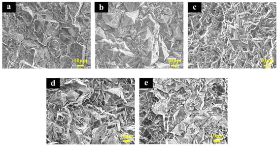 SEM of the electrodes: (a) Ti/Sb-SnO2/PbO2; (b) Ti/Sb-SnO2/1Bi-PbO2; (c) Ti/Sb-SnO2/2Bi-PbO2; (d) Ti/Sb-SnO2/3Bi-PbO2; and (e) Ti/Sb-SnO2/5Bi-PbO2.