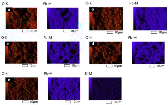 EDS Mapping of the electrodes: (a) Ti/Sb-SnO2/PbO2; (b) Ti/Sb-SnO2/1Bi-PbO2; (c) Ti/Sb-SnO2/2Bi-PbO2; (d) Ti/Sb-SnO2/3Bi-PbO2; and (e) Ti/Sb-SnO2/5Bi-PbO2.