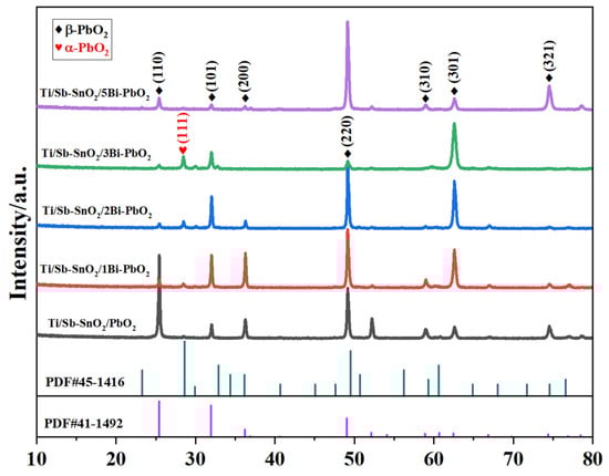 Figure 4 shows the XRD patterns of the as-prepared electrodes with a variation Bi3+concentration. As depicted in Figure 4, the diffraction peaks observed at 2θ = 25.4°, 32.0°, 36.2°, 52.1°, 58.9°, 62.5°, 74.4° were assigned to the (110), (101), (200), (220), (310), (301), and (321) planes of β-PbO2 (JCPDS#41-1492). The diffraction peaks observed at 2θ = 28.6° were assigned to the (111) plane of α-PbO2 (JCPDS#45-1416). It was found that all the electrodes exhibited reflections of β-PbO2 and α-PbO2. No peaks corresponding to bismuth oxide were detected in the XRD pattern of Ti/Sb-SnO2/xBi-PbO2, indicating that the doping amount of bismuth is small and lower than the detective limit of XRD. It should be noted that the crystalline of α-PbO2 and the main plane of β-PbO2 varied with the concentration of Bi3+ doping. The main planes of Ti/Sb-SnO2/PbO2 were (110) and (220). After doping with a low-concentration Bi(NO3)3 (≤2 mmol·L−1), the diffraction peaks of crystal planes (101) and (301) were enhanced, indicating that the directions of crystal planes (101) and (301) were preferentially selected. However, Bi(NO3)3 content which was too high was not favorable for the growth of crystal planes (101) and (301). When the concentration of Bi(NO3)3 was 5 mmol·L−1, the main plane of Ti/Sb-SnO2/5Bi-PbO2 was (220). These results imply that the doping concentration of Bi(NO3)3 affects the selective growth of β-PbO2 crystal planes.