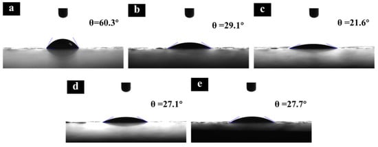 The hydrophilicity of the surfaces has been shown to promote the charge-transfer rate between the electrolytes and the electrodes, enhancing the oxygen evolution reaction activity. Therefore, the contact angle of the as-synthesized electrodes was measured to evaluate the surface wettability. As shown in Figure 6, the contact angles (θ) in Ti/Sb-SnO2/PbO2, Ti/Sb-SnO2/1Bi-PbO2, Ti/Sb-SnO2/2Bi-PbO2, Ti/Sb-SnO2/3Bi-PbO2, and Ti/Sb-SnO2/5Bi-PbO2 were 60.3°, 29.1°, 21.6°, 27.1°, and 27.7°, respectively. It can be found that much smaller θ are observed for the Ti/Sb-SnO2/xBi-PbO2 electrode compared to pure Ti/Sb-SnO2/PbO2 (60.3°), indicating the enhanced compatibility and affinity of the electrode for Bi3+ doping, which in turn leads to enhancement of their catalytic activity in the OER. When the concentration of Bi(NO3)3 further increases, the contact angles of Ti/Sb-SnO2/3Bi-PbO2 and Ti/Sb-SnO2/5Bi-PbO2 are slightly higher than that of Ti/Sb-SnO2/2Bi-PbO2, which may be ascribed to the change of crystal planes for the electrode.