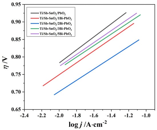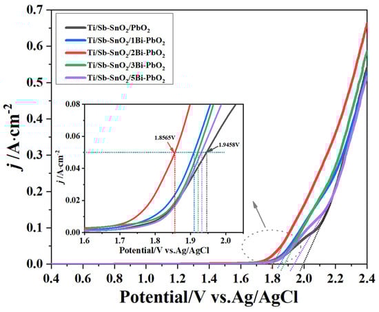 An LSV test was performed to obtain the oxygen evolution potentials (OEP) of the as-prepared electrodes, as displayed in Figure 7. The results show that the OEP of the electrode decreases with the addition of Bi(NO3)3. The onset potentials for OEP on Ti/Sb-SnO2/PbO2, Ti/Sb-SnO2/1Bi-PbO2, Ti/Sb-SnO2/2Bi-PbO2, Ti/Sb-SnO2/3Bi-PbO2, and Ti/Sb-SnO2/5Bi-PbO2 are 1.99 V, 1.84 V, 1.80 V, 1.87 V, and 1.93 V (vs. Ag/AgCl), respectively. This implies that the introduction of Bi3+ provides more active sites for the oxygen evolution reaction, and that the electrocatalytic activity gradually increased. Furthermore, as shown in Figure 7, the potential of the Ti/Sb-SnO2/2Bi-PbO2 electrode is found to be 89 mV lower than that of the Ti/Sb-SnO2/PbO2 electrode (500 A/m2), indicating that the addition of Bi3+ can effectively improve the electrocatalytic activity of the PbO2 electrode. However, when the concentration was greater than 2 mmol·L−1, there was little difference in potential, and the increase of Bi3+ resulted in the excessive increase of PbO2 crystal grain. This may cause a decrease in surface roughness and a decrease in the active regions involved in the reaction.