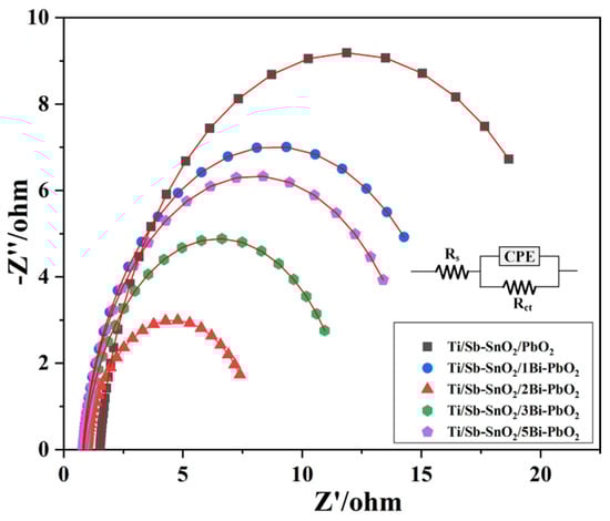 EIS measurements were conducted to further explain the influence of Bi(NO3)3 on the oxygen evolution capacity of the PbO2 coatings. Figure 8 exhibits the electrochemical impedance of PbO2 electrodes with an applied potential of 1.90 V vs. Ag/AgCl, which corresponds to the oxygen evolution zone. In the equivalent circuits, Rs, Rct, and constant phase angle element (CPE) represent the ohmic resistance, the charge-transfer resistance, and the double-layer capacitance. The Rs include the electrolyte resistance and the active material resistance. Rct reflects the oxygen release reaction activity. The CPE was employed to substitute the capacitance when n is between 0.9 and 1. The simulation data for each parameter are shown in Table 3. The Rct value of the Ti/Sb-SnO2/2Bi-PbO2 electrode is 7.30 ohm, which is lower than those of the other electrodes. The Ti/Sb-SnO2/PbO2 electrode exhibits the largest Rct value of 20.80 ohm. Furthermore, the Rct value gradually reduced with the addition of Bi(NO3)3. The minimum value was obtained when the Bi(NO3)3 concentration was 2 mmol·L−1. On the contrary, the Rct value increased slightly when the Bi(NO3)3 concentration was further increased, indicating that the modification of Bi3+ could significantly increase the catalytic activity of the coating, and that the optimum Bi(NO3)3 concentration is 2 mmol·L−1. It can be inferred that high oxygen evolution activity and low Rct are in favor of the catalytic activity. Earlier research has observed that oxygen evolution activity depends on the active site of the PbO2 coating, and that large active sites imply good reactivity [39].