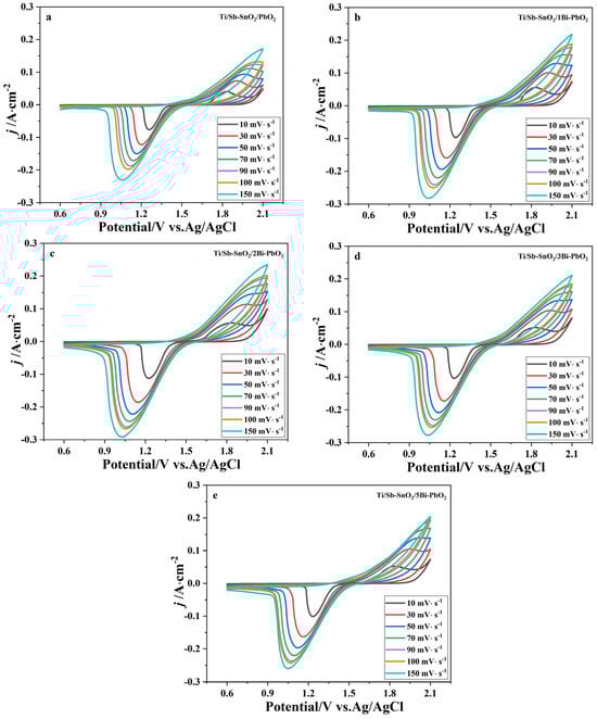 CV curves of the as-prepared electrode under different scan rates: (a) Ti/Sb-SnO2/PbO2; (b) Ti/Sb-SnO2/1Bi-PbO2; (c) Ti/Sb-SnO2/2Bi-PbO2; (d) Ti/Sb-SnO2/3Bi-PbO2; and (e) Ti/Sb-SnO2/5Bi-PbO2.