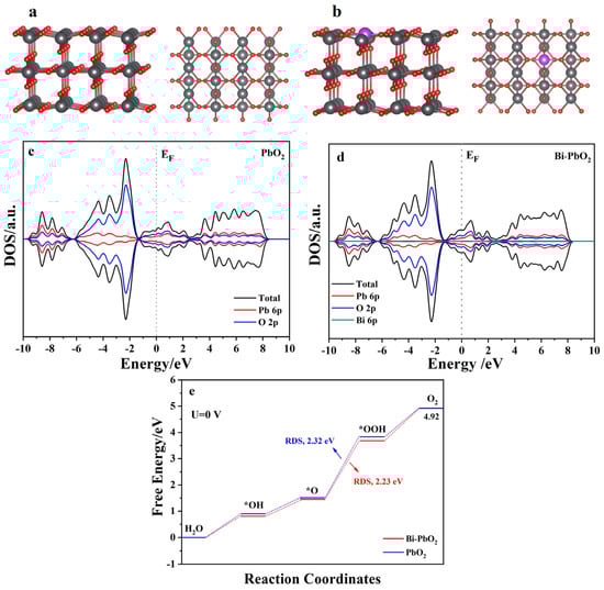 (a,b) Structural diagrams of PbO2 and Bi−PbO2, respectively (black, red, and purple spheres represent Pb, O, and Bi atoms, respectively); (c,d) Density of States for PbO2 and Bi−PbO2, respectively; (e) free−energy diagrams for OER in PbO2 and Bi−PbO2, respectively (* represent the ctive site on the surface model).
