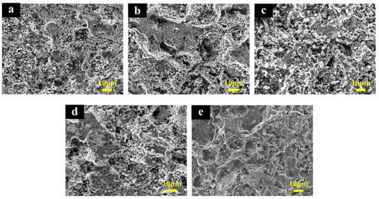 SEM of the deactivated electrodes: (a) Ti/Sb-SnO2/PbO2; (b) Ti/Sb-SnO2/1Bi-PbO2; (c) Ti/Sb-SnO2/2Bi-PbO2; (d) Ti/Sb-SnO2/3Bi-PbO2; (e) Ti/Sb-SnO2/5Bi-PbO2.