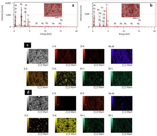 (a) the EDS of the deactivated Ti/Sb-SnO2/PbO2 electrode; (b) the EDS of the deactivated Ti/Sb-SnO2/2Bi-PbO2 electrode; (c) EDS-mapping of the deactivated Ti/Sb-SnO2/PbO2 electrode; and (d) EDS-mapping of the deactivated Ti/Sb-SnO2/2Bi-PbO2 electrode.