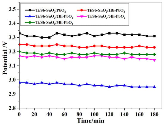 where E1 − E2 is the electrode polarization potential, including the theoretical decomposition voltage and overpotential of ZnSO4. R is the total resistance, including the electrode resistance, electrolyte resistance, and contact resistance. The average cell potentials of Ti/Sb-SnO2/PbO2, Ti/Sb-SnO2/1Bi-PbO2, Ti/Sb-SnO2/2Bi-PbO2, Ti/Sb-SnO2/3Bi-PbO2, and Ti/Sb-SnO2/5Bi-PbO2 are 3.32 V, 3.24 V, 2.96 V, 3.16 V, and 3.18 V, respectively. It can be seen that the doping of Bi3+ reduces the cell voltage of the electrodes. From the Tafel curve, it can be found that the b value decreases with the introduction of Bi3+, indicating a small overpotential of the electrode. According to Equation (9), the cell voltage decreases with the decrease in the polarization potential. Moreover, it should be noted that the polarization potential has a positive relationship with the overpotential. Therefore, the decrease in overpotential results in a decrease in voltage drop. Commonly, the small cell potential is favorable for the reduction in energy consumption. The smallest cell voltage was obtained by the Ti/Sb-SnO2/2Bi-PbO2 electrode, suggesting less energy consumption during zinc electrowinning.