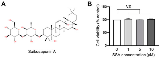 An examination of the cytotoxic effects of SSA. (A) Chemical structure of SSA. (B) HaCaT cells were exposed to varying concentrations of SSA for 24 h. Cell viabilities were measured using the Cell Counting Kit-8 (CCK-8). Bars indicate the mean ± S.D. (n = 3). NS = no significance, NS p = 0.1941 (0 vs. 1 μM), NS p = 0.6947 (0 vs. 5 μM), NS p = 0.1491 (0 vs. 10 μM) by Sidak’s multiple comparisons test.