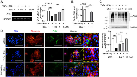The immunoblot analysis showed that pretreatment with SSA effectively abrogated the TNFα + IFNγ-mediated FLG downregulation in protein levels (Figure 2C). Fluorescence immunocytochemical staining showed that TNFα + IFNγ treatment reduced the cytoplasmic localization of FLG, which was significantly recovered in the presence of SSA (Figure 2D). These data suggest that SSA can restore TNFα + IFNγ-induced FLG suppression in mRNA and protein levels in HaCaT cells.