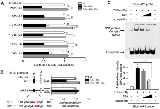 The EMSA data showed that the SSA treatment substantially reduced the DNA–protein complex induced by TNFα + IFNγ treatment (Figure 3C). These data demonstrate that the AP1-binding motif of the FLG promoter is the functional response element of SSA involved in the restoration of the reduced FLG promoter activity by TNFα + IFNγ.