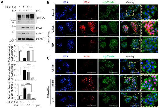Effect of SSA on inhibiting the TNFα + IFNγ-induced expression of FRA1 and c-Jun. (A) HaCaT cells were treated with TNFα + IFNγ for 24 h with or without SSA. FLG, FRA1, c-Jun, and GAPDH protein levels were measured using immunoblotting. The quantitative band intensities of FLG, FRA1, and c-Jun proteins were normalized relative to that of GAPDH using ImageJ version 1.52a software. The data are displayed as mean ± SD (n = 3). * p < 0.1, *** p < 0.001, **** p < 0.0001. (B,C) HaCaT cells cultured on coverslips were treated with TNFα + IFNγ for 24 h in the presence or absence of 1 μM SSA, and immunofluorescence staining was performed using anti-FRA1 (B) and anti-c-JUN (C). Anti-α/β-Tubulin (green) antibodies were utilized to visualize the cytoplasm. Hoechst 33258 was utilized to counterstain the nuclear DNA (blue). Scale bars, 200 μm. SSA, saikosaponin A.
