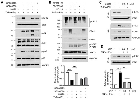 FRA1 and c-Jun were expressed when mitogen-activated protein kinases (MAPKs) were stably activated [22,23]. ERK activation induces FRA1 accumulation and dimerization of FRA1 and c-Jun at the AP1-binding site of target gene promoters [24,25]. As TNFα and IFNγ stimulate the MAPK pathway in HaCaT cells [13], the effect of SSA on the modulation of MAPK signaling was determined. Consistent with a previous report [13], the TNFα + IFNγ-induced phosphorylation of ERK1/2, JNK, and p38 kinase decreased upon pretreatment with U0126 (MAPK inhibitor), SB203580 (p38 kinase inhibitor), and SP600125 (JNK inhibitor) (Figure 5A). The effect of these inhibitors on the modulation of FLG, FRA1, and c-Jun expressions was further addressed under TNFα + IFNγ stimulation. Immunoblotting data showed that U0126 pretreatment restored the suppression of FLG expression and repressed the expression of FRA1 and c-Jun in TNFα + IFNγ-treated HaCaT keratinocytes (Figure 5B). Furthermore, the inhibition of ERK phosphorylation by U0126 pretreatment suppressed the accumulation of FRA1 and c-Jun proteins induced by TNFα + IFNγ (Figure 5C). The effect of SSA on ERK phosphorylation was determined. SSA reduced the TNFα + IFNγ-induced phosphorylation of ERK1 in a dose-dependent manner (Figure 5D). These data suggest that SSA modulates the TNFα + IFNγ-induced expression of FLG, FRA1, and c-Jun via ERK inhibition.
